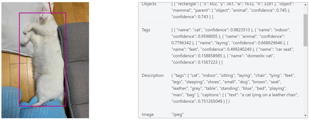 두 번째 사진은 "가죽 의자 위에 누워있는 고양이" (예상 정확도: 0.75)로 나왔습니다. 나무 바닥을 가죽 의자로 오인식했습니다. Azure AI의 배경 인식 정확도는 객체 인식보다 낮은 것으로 보입니다. 하지만 "누워있는" 고양이라는 것은 정확히 예측했습니다.