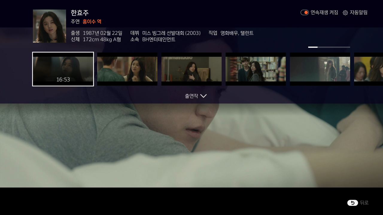 아마존 X-Ray와 유사한 국내 IPTV 서비스입니다. 아마존과는 다르게 인물의 등장 장면까지 제공합니다. 관심 있는 인물의 특정 등장 장면을 찾아 재생하거나, 모든 등장 장면을 연속으로 재생할 수 있습니다.