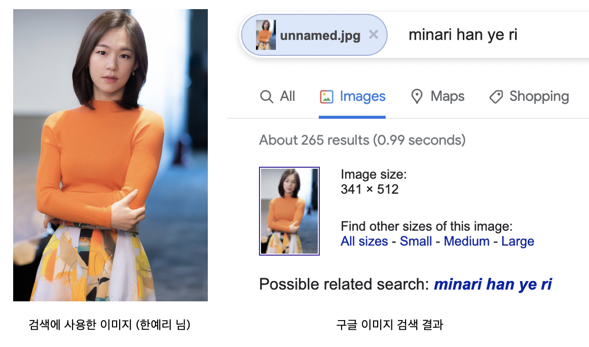 연예인들은 수집할 수 있는 사진이 많습니다. 학습할 이미지가 많으니 AI가 인식하기도 쉽습니다. 얼굴은 아는데 이름이 기억나지 않는 배우의 이름이 궁금할 때가 있습니다. 그 배우의 사진만 가지고 있다면 문제는 금방 해결됩니다. 사진으로 검색하기 기능에 이름을 알고 싶은 배우의 사진을 첨부하면 이름은 물론이고 필모그래피까지 한방에 나오니까요.