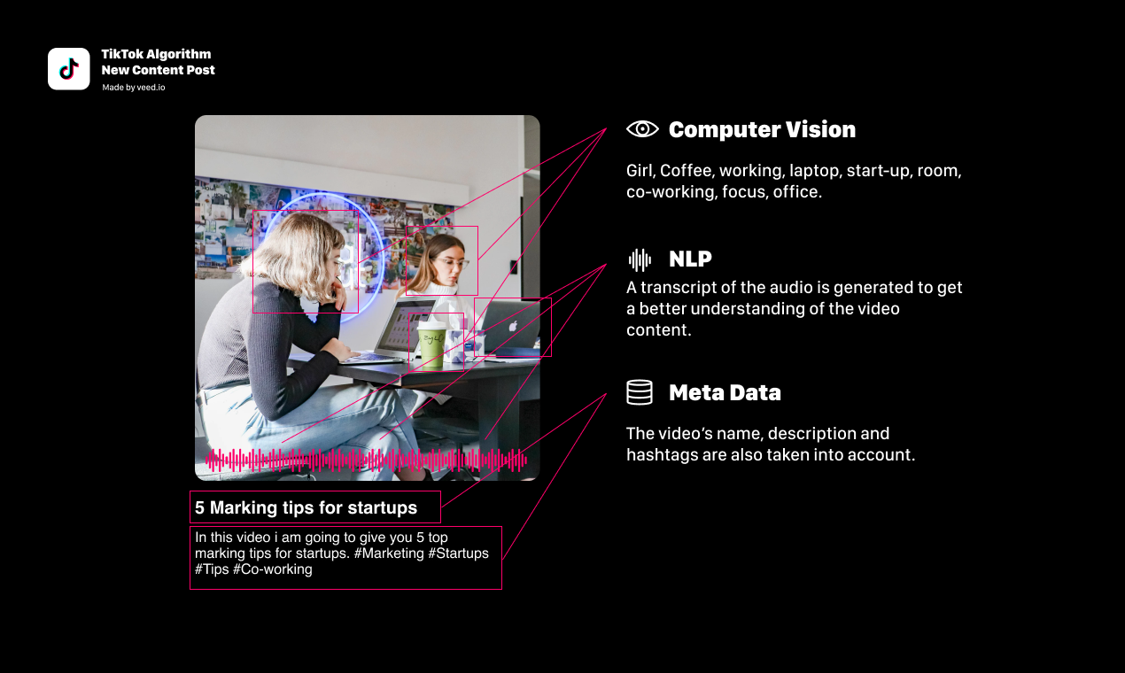 먼저, 틱톡은 사용자가 등록된 영상의 메타 정보를 분석합니다. 영상에 대한 메타 정보가 풍부할수록 사용자에게 딱 맞는 콘텐츠를 추천하기에 용이합니다.