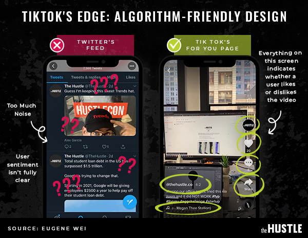 기존 SNS의 UI처럼 사용자의 화면에 여러 개의 피드가 떠있으면 그중 어떤 콘텐츠를 더 오랫동안 봤는지 분석하기 어렵습니다. 물론 기존 UI를 사용하더라도 사용자의 댓글이나 좋아요 이력을 분석에 활용할 수 있으나 이것만으로는 추천 알고리즘을 위한 데이터가 부족합니다. (출처: Eugene Wei )