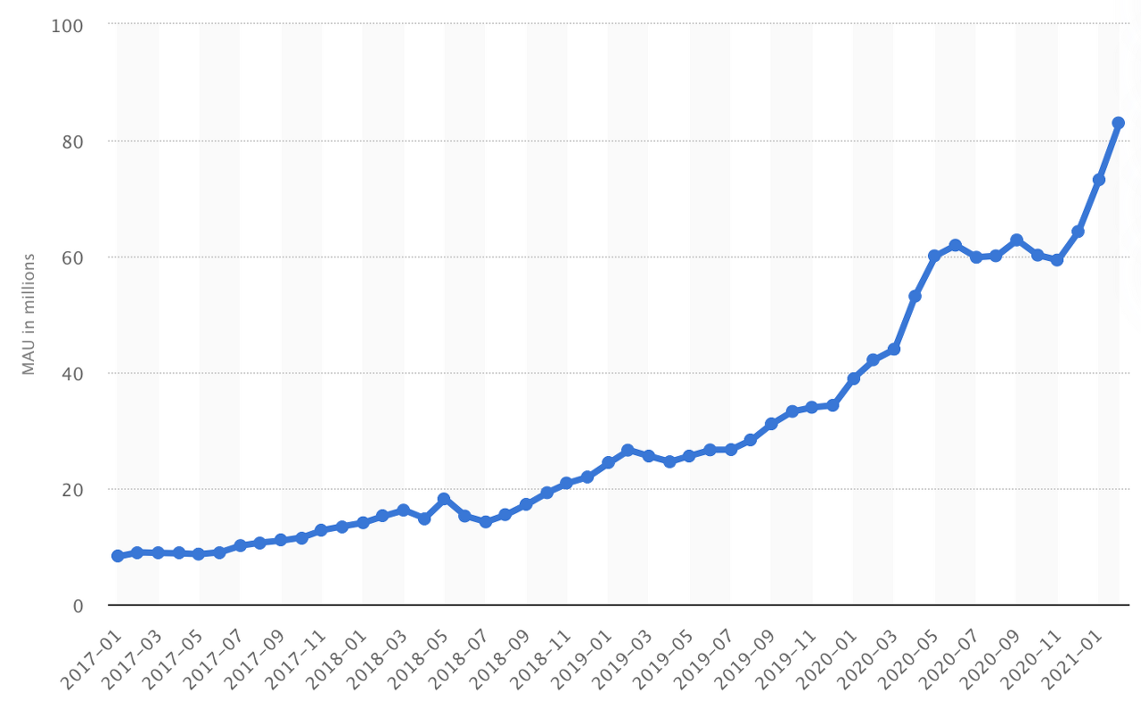 Statista Research Department에 따르면, 틱톡의 월간 유저수(MAU)는 '17년부터 꾸준히 성장하며, '20년부터 급격한 상승 곡선을 그립니다. '21년 1월 기준 약 8,600만 명의 월간 유저를 보유한 것으로 추정됩니다.