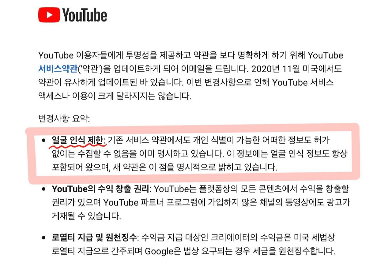 며칠 전, 유튜브 서비스 약관 업데이트 메일을 받았습니다. 그중 "얼굴 인식 제한"이라는 항목이 제 관심을 끌었습니다. 약관에 적힌 내용만 봐서는 도통 무슨 말인지 모르겠더라고요. 그래서 구글링을 시작했습니다.
