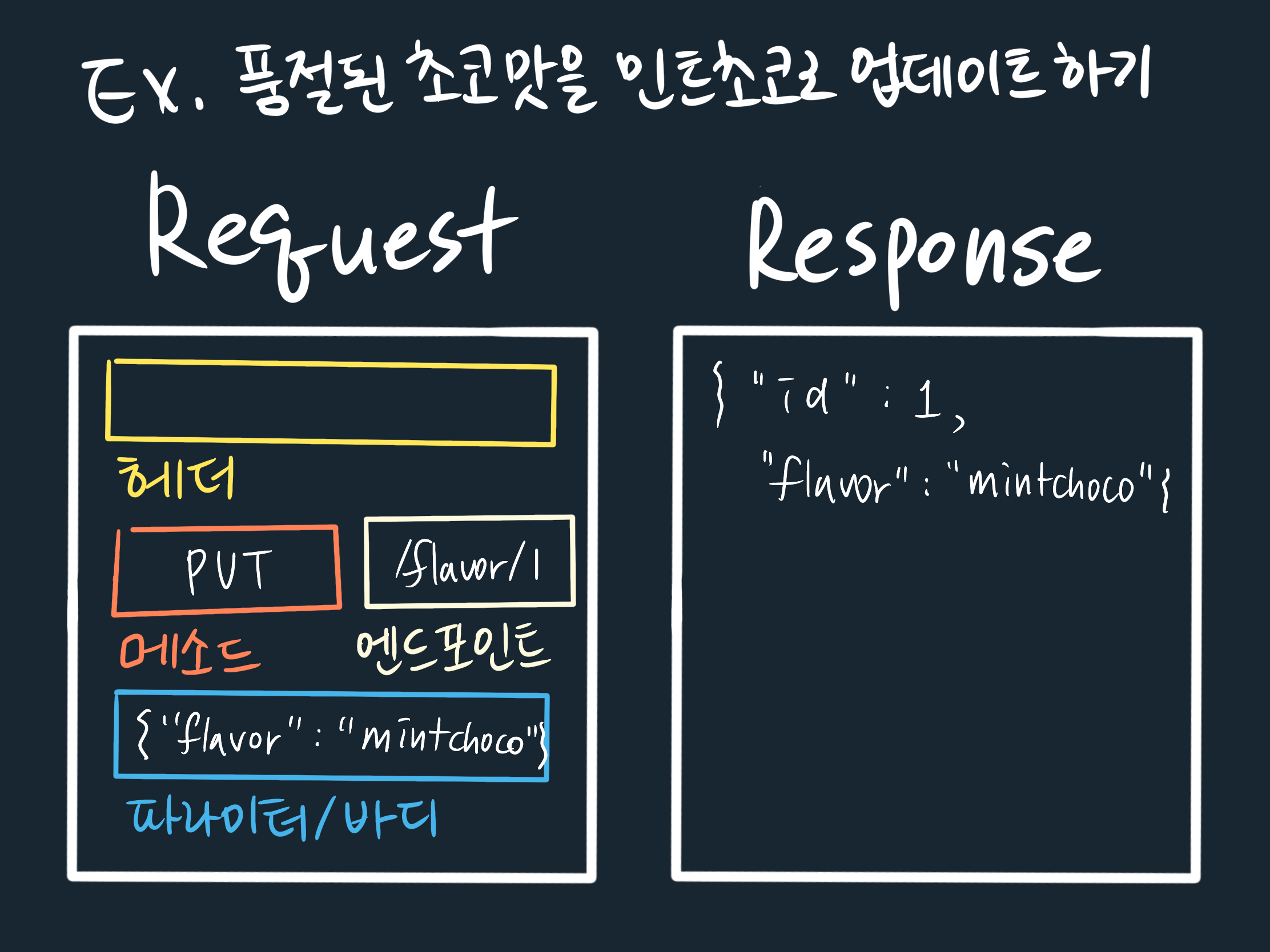 초코 맛의 인기가 폭발적이어서 품절되어 버렸어요. 초코를 민트초코로 바꿔야 됩니다. 그러면 엔드포인트에 초코 맛의 아이디인 1을 적고, 파라미터/바디에 업데이트할 맛의 정보를 적습니다. 서버의 응답에서 id 1번에 해당하는 맛이 민트 초코로 바뀌었다고 알려줍니다.
