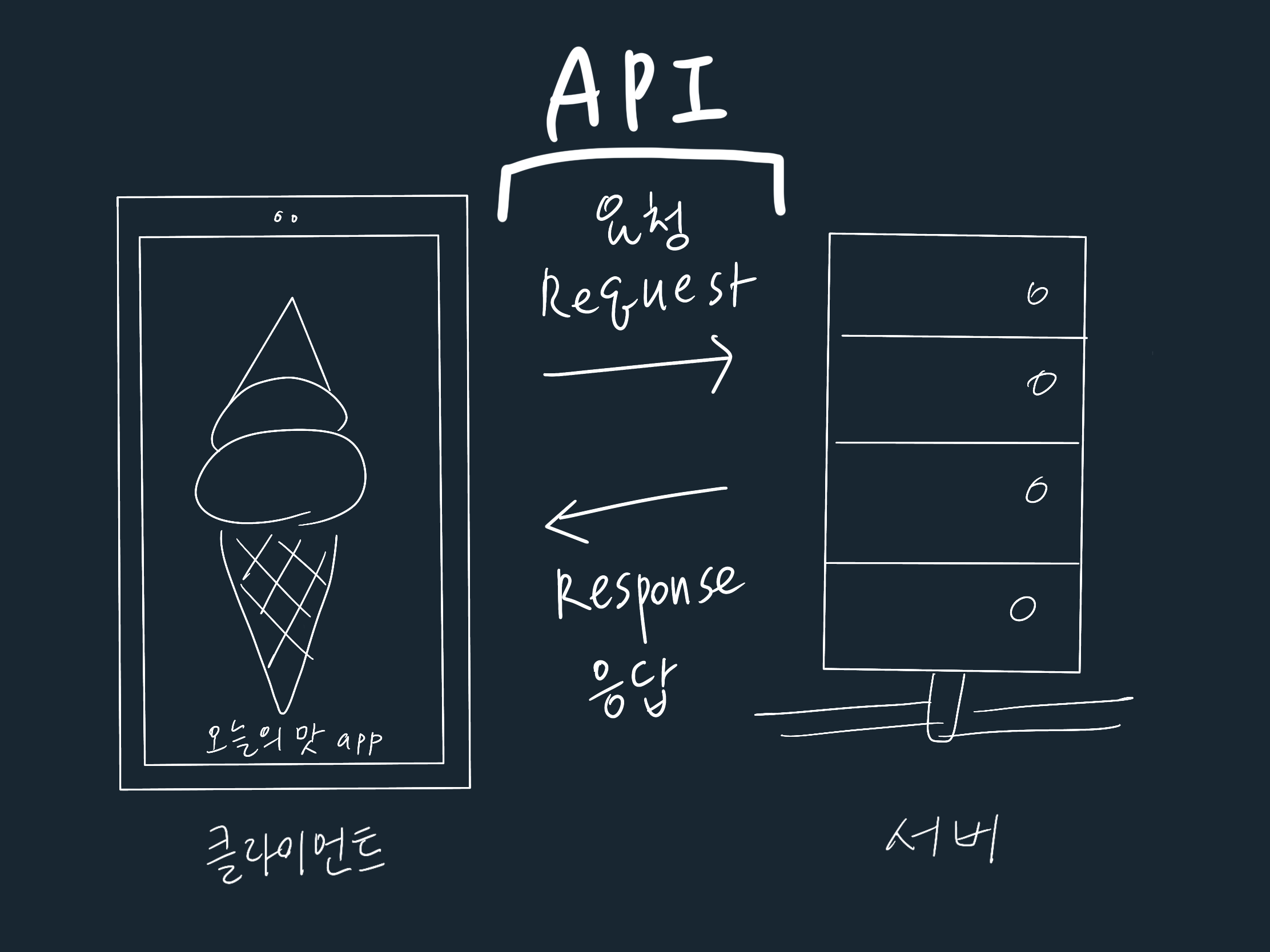 API는 클라이언트와 서버가 통신하는 방식입니다. 클라이언트는 서버에 "이 메시지 보내줘", "로그인 해줘"와 같은 요청(request)을 보내고, 서버는 그에 맞게 응답(response)합니다.