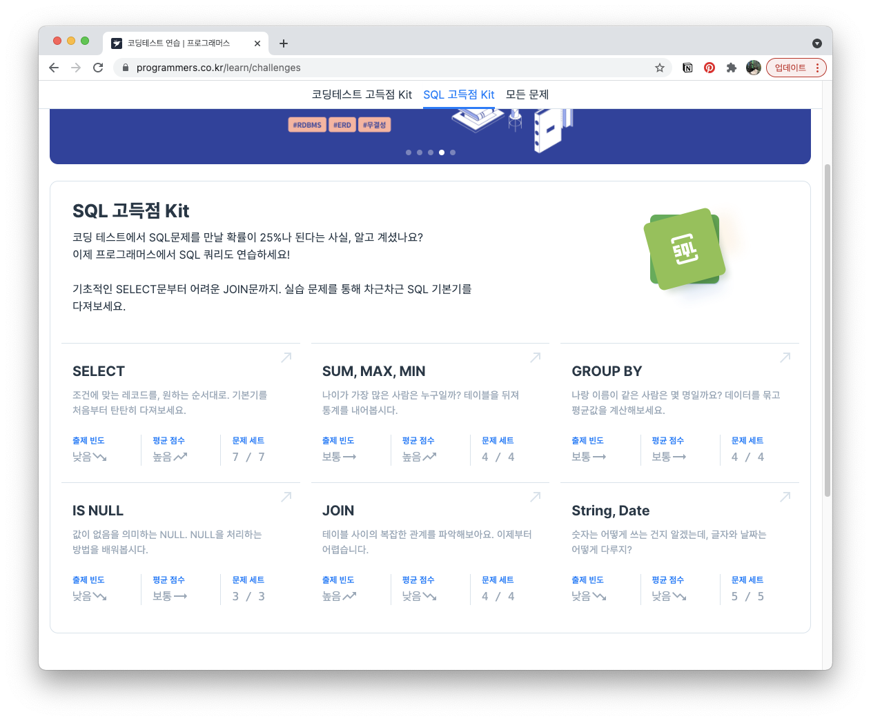 복습용으로 문제만 풀고 싶을 때 프로그래머스의 SQL 고득점 Kit가 유용한 것 같다.