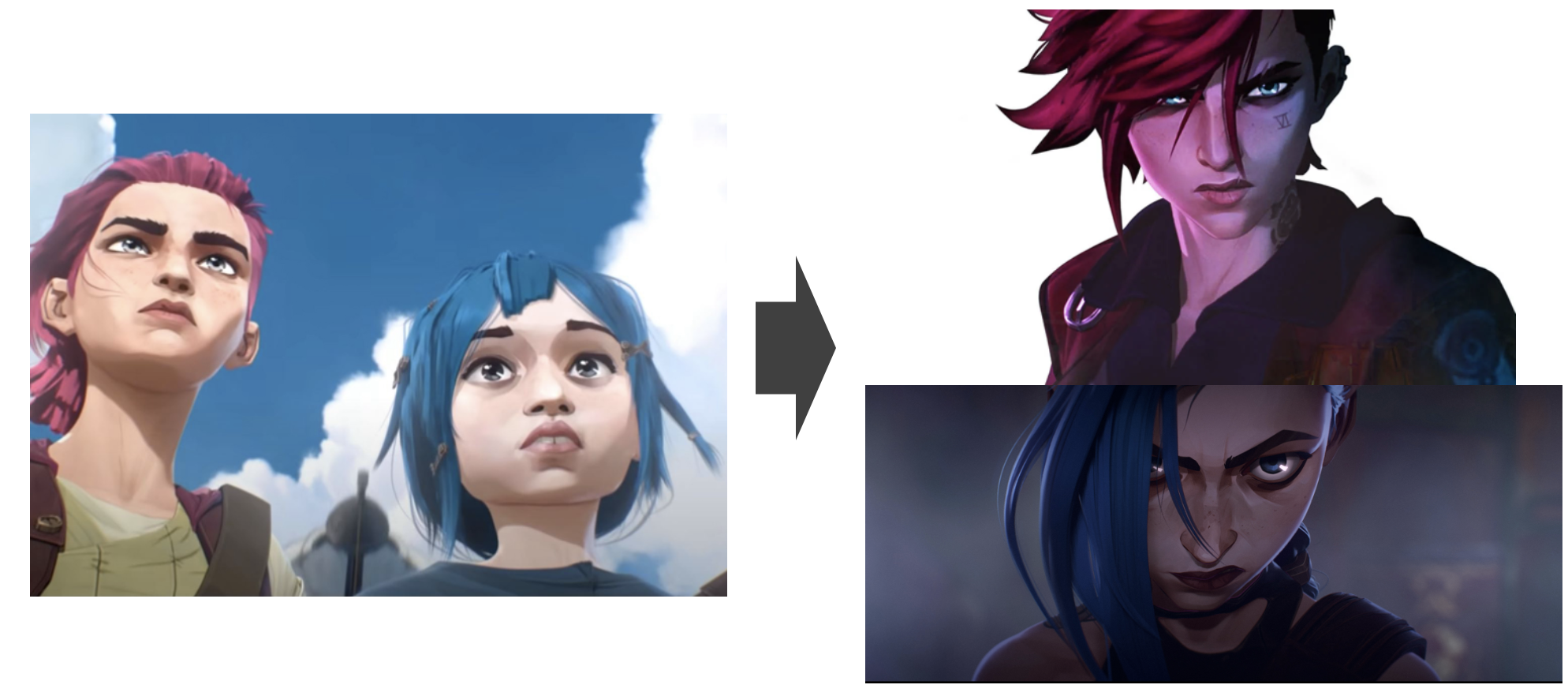 게다가 영상 제작자가 몇 가지 생김새로 힌트를 준다. 아케인은 머리 색으로 인물을 뚜렷하게 구분할 수 있도록 한다. 만약 AI가 애니메이션 캐릭터를 더 정확하게 인식하고자 한다면 학습 시에 머리 색을 피처로 포함해야 한다.