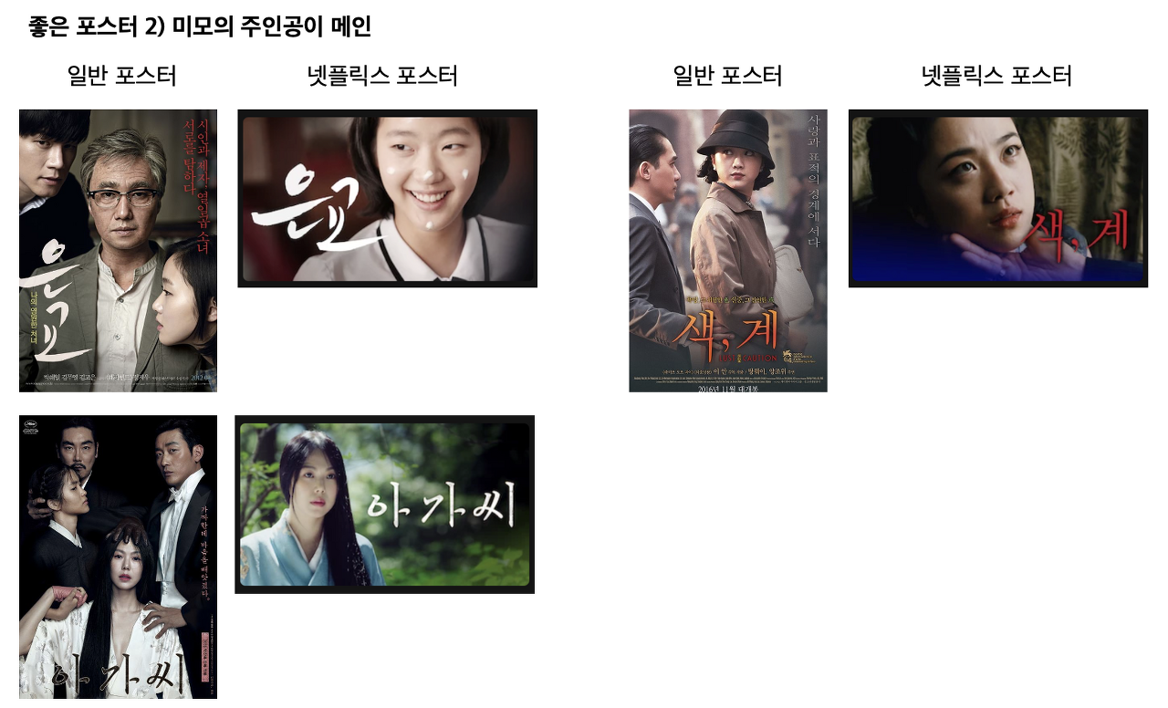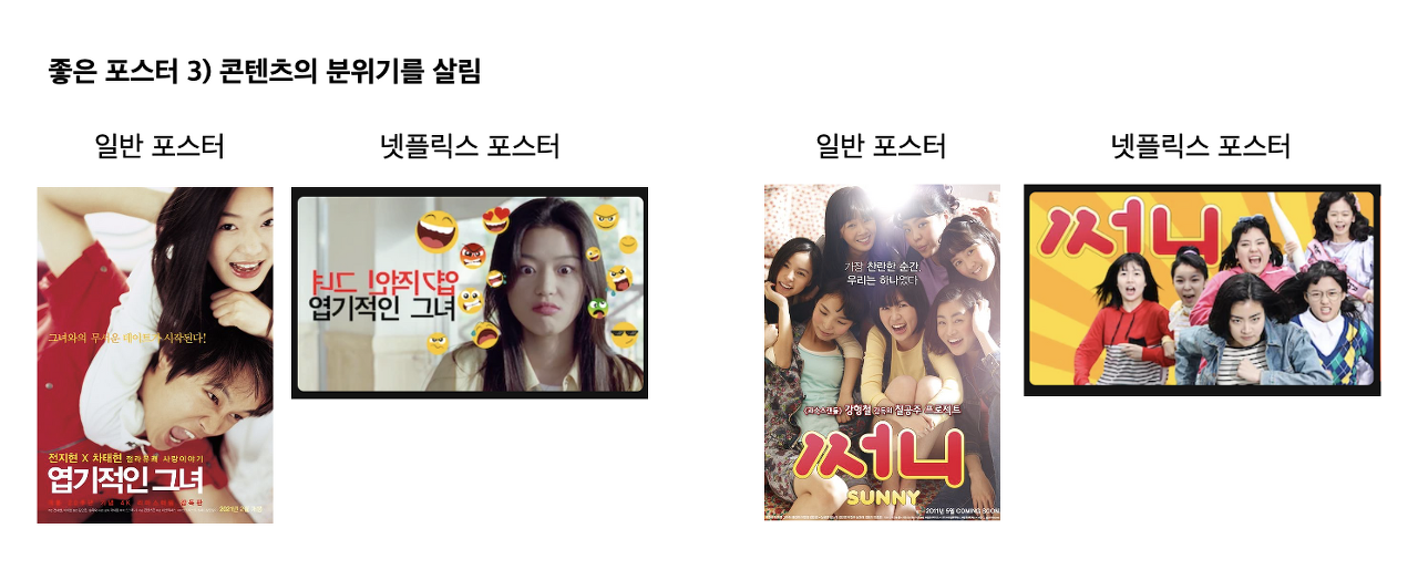 콘텐츠의 분위기를 살린 포스터는 해당 장르를 선호하는 사용자에게 효과적입니다. 엽기적인 그녀와 써니 모두 코믹한 영화입니다. 넷플릭스는 등장인물의 개성 있는 성격과 포즈, 통통 튀는 디자인 요소로 콘텐츠의 코믹한 분위기를 표현했습니다. 개인적으로 "엽기적인 그녀" 포스터를 참 잘 만들었다고 생각합니다. "엽기적인 그녀"는 2001년 작으로 기존 포스터가 오래되어 보이는데, 이모티콘을 붙여서 세련되게 디자인했습니다.