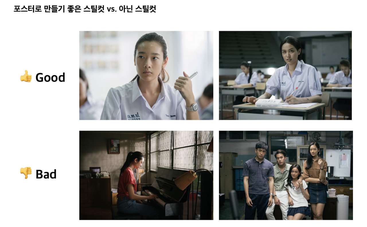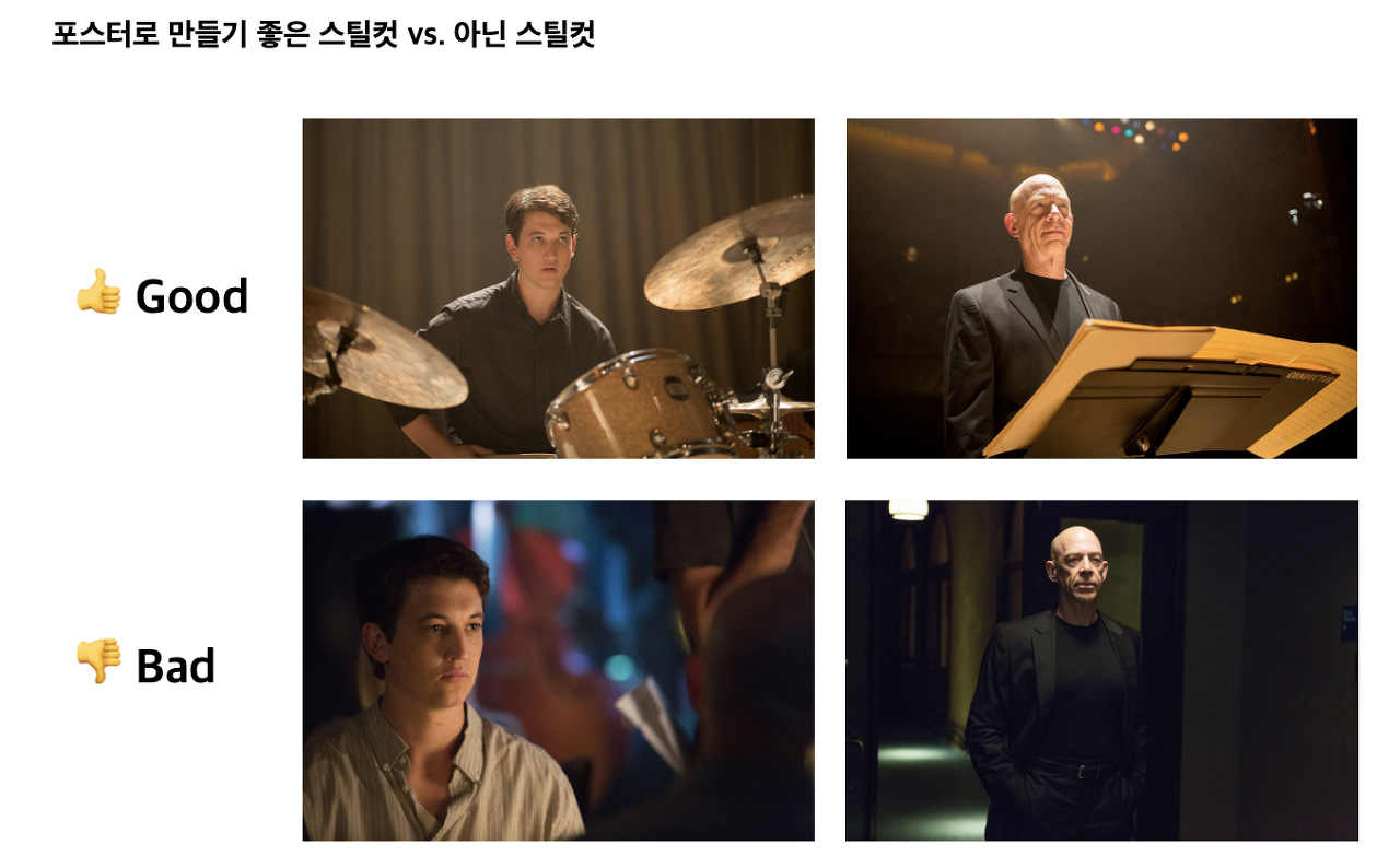 중심 배경 혹은 소재가 포함된 장면이 포스터로 쓰기에 더 적절합니다. 위플래시는 드럼이 소재가 되는 영화입니다. 드럼 교수와 학생의 갈등을 그리죠. 출연 배우가 배드 지니어스보단 익숙하지만 드럼이 없는 포스터가 만들어진다면 해당 영화가 드럼을 소재로 한다는 사실을 알 수 없습니다. 러닝타임 내내 드럼이 나오는데, 아래 두 이미지로 만들어진 포스터로 콘텐츠에 진입한 시청자는 당황스러울 가능성이 높습니다.