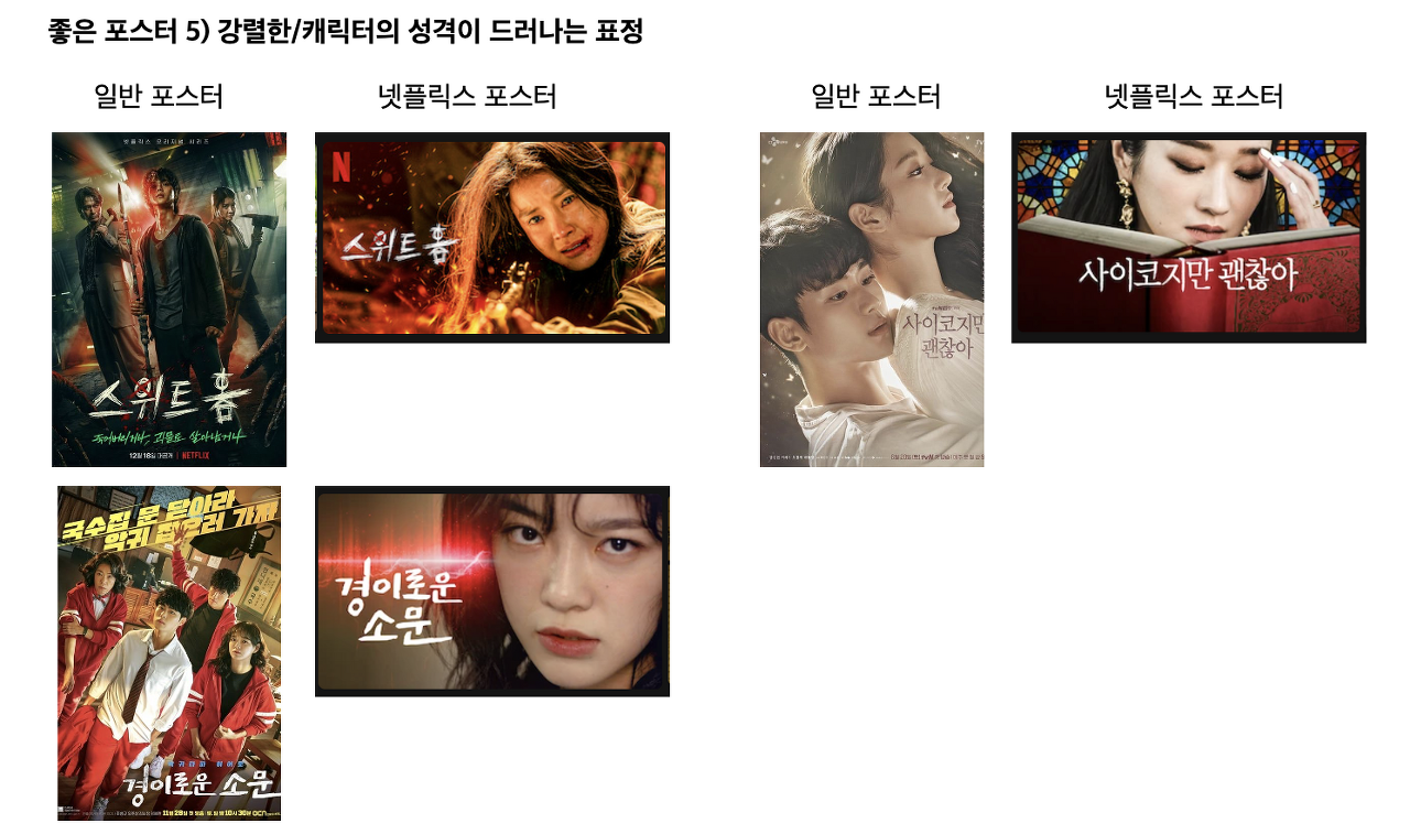 넷플릭스 통계에 따르면 인물의 강렬한 표정은 더 높은 클릭률을 이어집니다. 강렬한 표정, 혹은 캐릭터의 성격을 잘 보여주는 표정이 포함된 포스터는 캐릭터에 대한 이해를 돕고 콘텐츠에 대한 관심도 이끌어냅니다.
