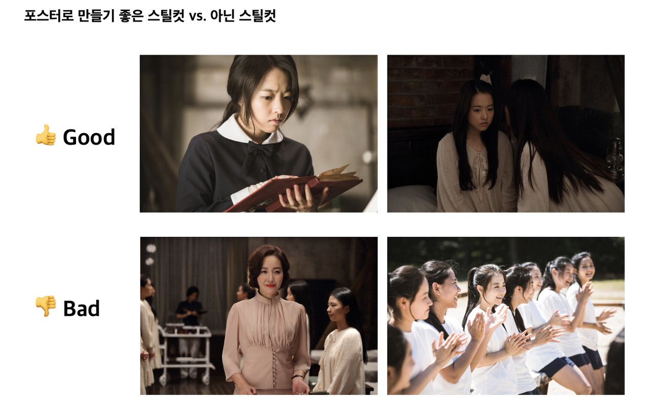 10월에 AI 자동 포스터 제작 시스템이 개발되었고, 지금까지 약 400편의 영화에서 포스터를 추출했습니다. AI가 자동으로 주연 인물 별로 여러 장의 포스터를 만들면 사람이 그중에서 가장 적절한 포스터를 가려내야 합니다. 그러기 위해선 좋은 포스터에 관한 합의가 필요하죠. 여러 콘텐츠에서 AI가 만든 포스터를 보면서 알게 된, 좋은 포스터와 그렇지 않은 포스터의 기준을 정리했습니다.