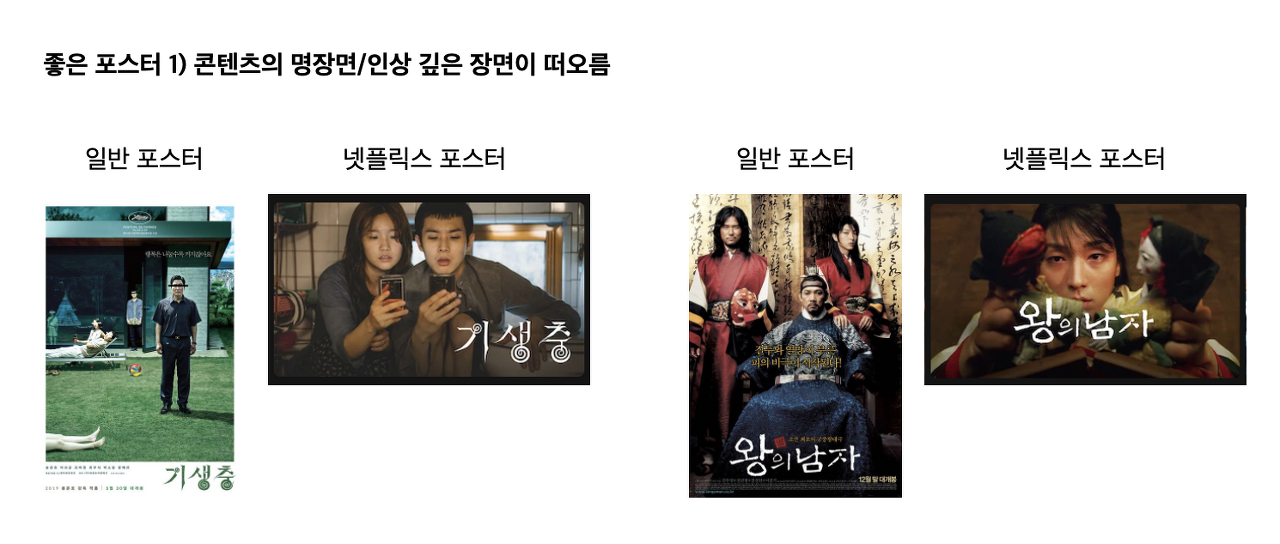 넷플릭스는 다수의 포스터를 제작하고, 사용자에 선호에 맞는 포스터를 추천합니다. (관련 글: 가장 많이 선택받는 포스터의 비밀) 덕분에 넷플릭스에서는 기성 포스터만이 아니라 스틸컷/영상 캡처 화면을 기반으로 만든 포스터를 볼 수 있습니다. 포스터를 사용자 별로 다르게 추천하려면 여러 버전의 포스터가 필요합니다. 기성 포스터 외에 새로운 포스터를 제작할 때 (특히 자동화 과정을 거친다면) 퀄리티를 보장하기 위해 좋은 포스터의 기준을 세워야 하죠.