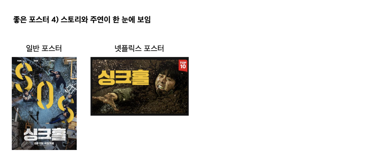 실제로 넷플릭스 테크 블로그에 따르면 포스터 속의 인물이 적을수록 클릭률이 높다고 합니다. 따라서 우측 넷플릭스의 포스터는 싱크홀에 빠진 상황을 직관적으로 표현하며, 한 유명 배우의 얼굴이 잘 보이므로 콘텐츠에 대한 신뢰도와 관심을 높이는 좋은 포스터입니다.