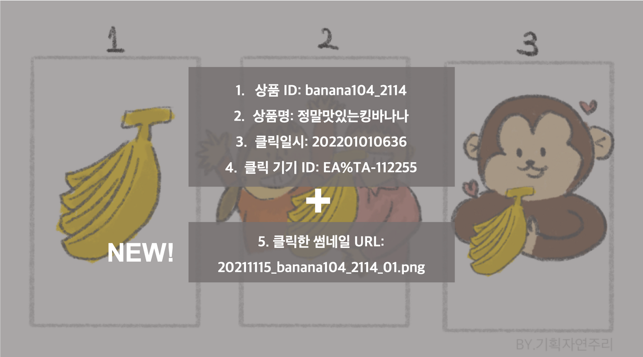 1) 바나나만 있는 썸네일, 2) 아이들과 바나나가 있는 썸네일, 3) 원숭이가 바나나를 들고 있는 썸네일 세 개중 사람들이 가장 많이 클릭하는 디자인을 알고 싶다면 로그를 어떻게 남겨야 할까요?
