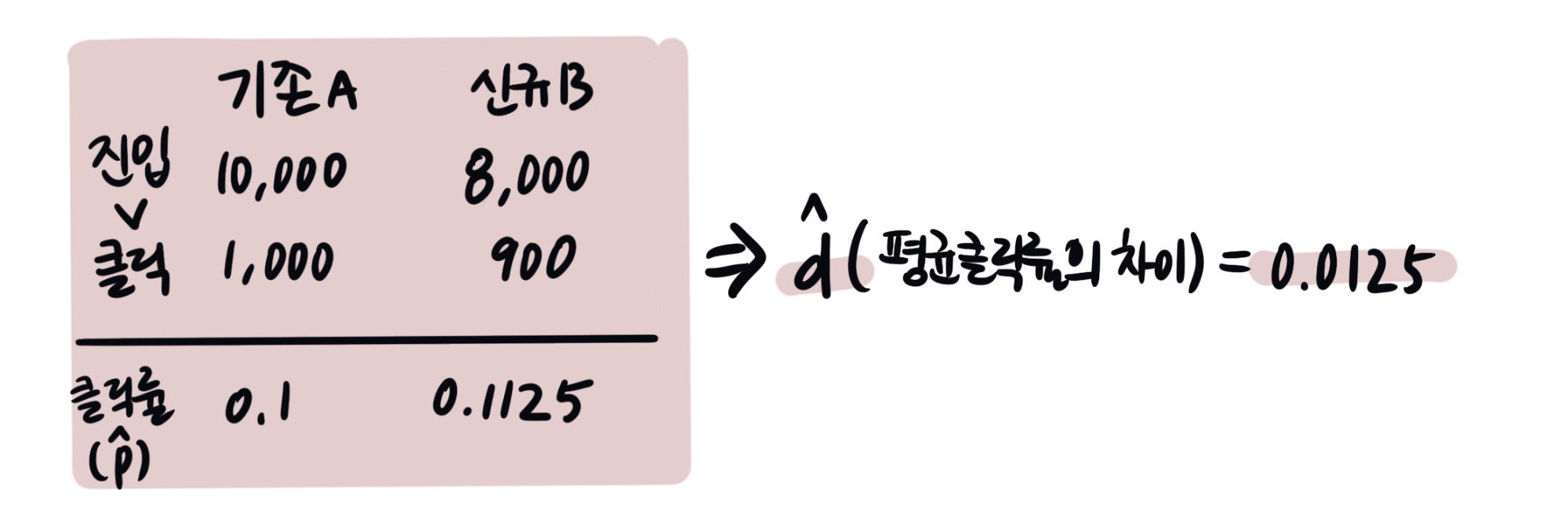 클릭률이 10%인 A 안과 클릭률이 11.25%인 B 안의 차이가 유의미한지 검증해볼까요? 두 조건의 클릭률의 차이는 1.25%입니다.