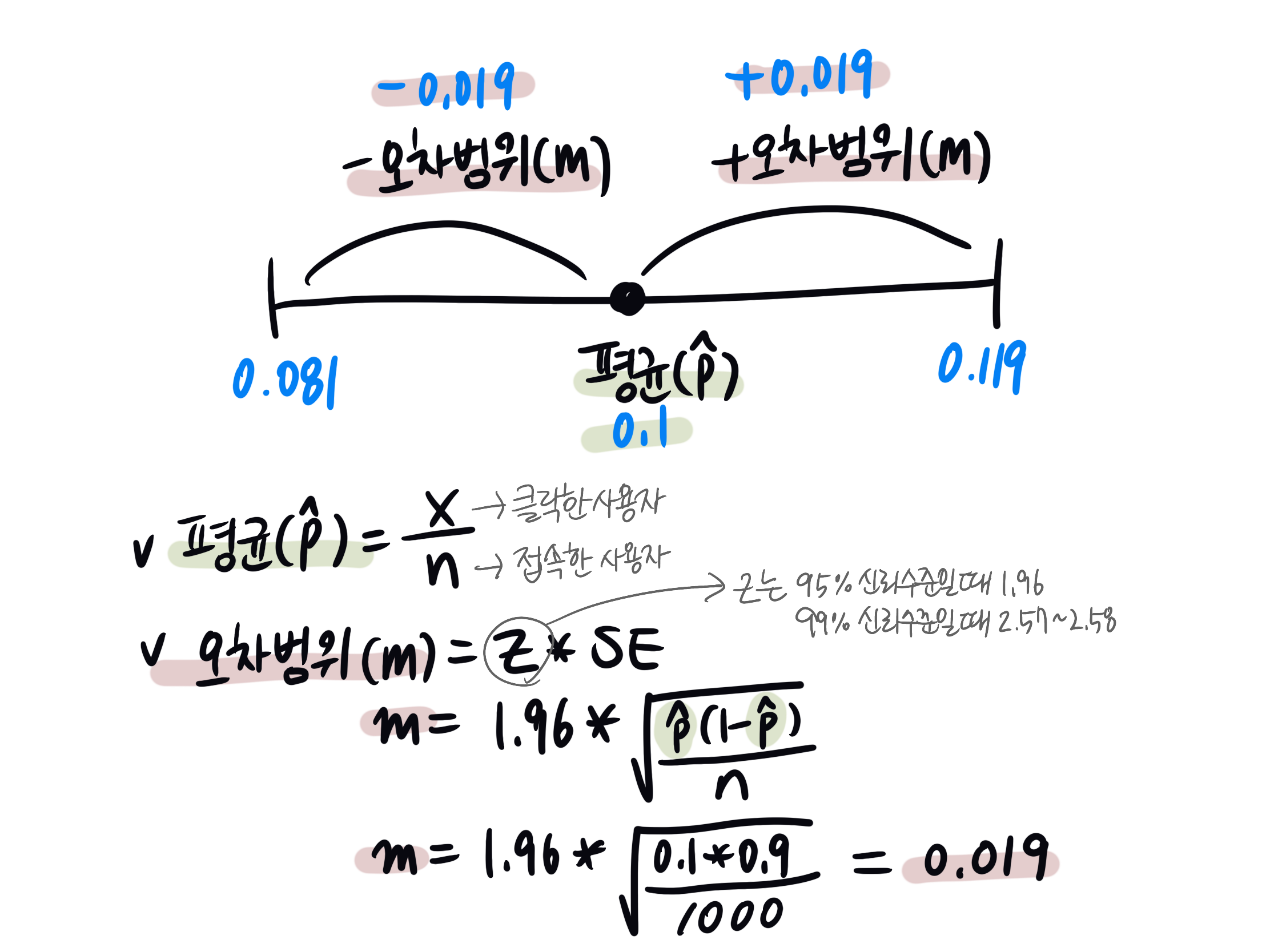 랜덤으로 뽑은 1,000명 중 100명이 버튼을 클릭했습니다. 이때 전환율은 0.1입니다. 그러나 1,000명의 전환율은 10,000명의 실제 전환율과 일치하지 않을 수 있습니다. 그래서 표본 평균을 "신뢰 구간", 즉 "표본 평균±오차 범위"의 구간으로 표시하죠. 위 예시를 95% 수준의 신뢰 구간은 "0.1±0.019"입니다. 표본집단의 전환율을 반복해서 측정하면, 전환율의 95%가 0.081~0.119 사이에서 발견되리란 뜻입니다.