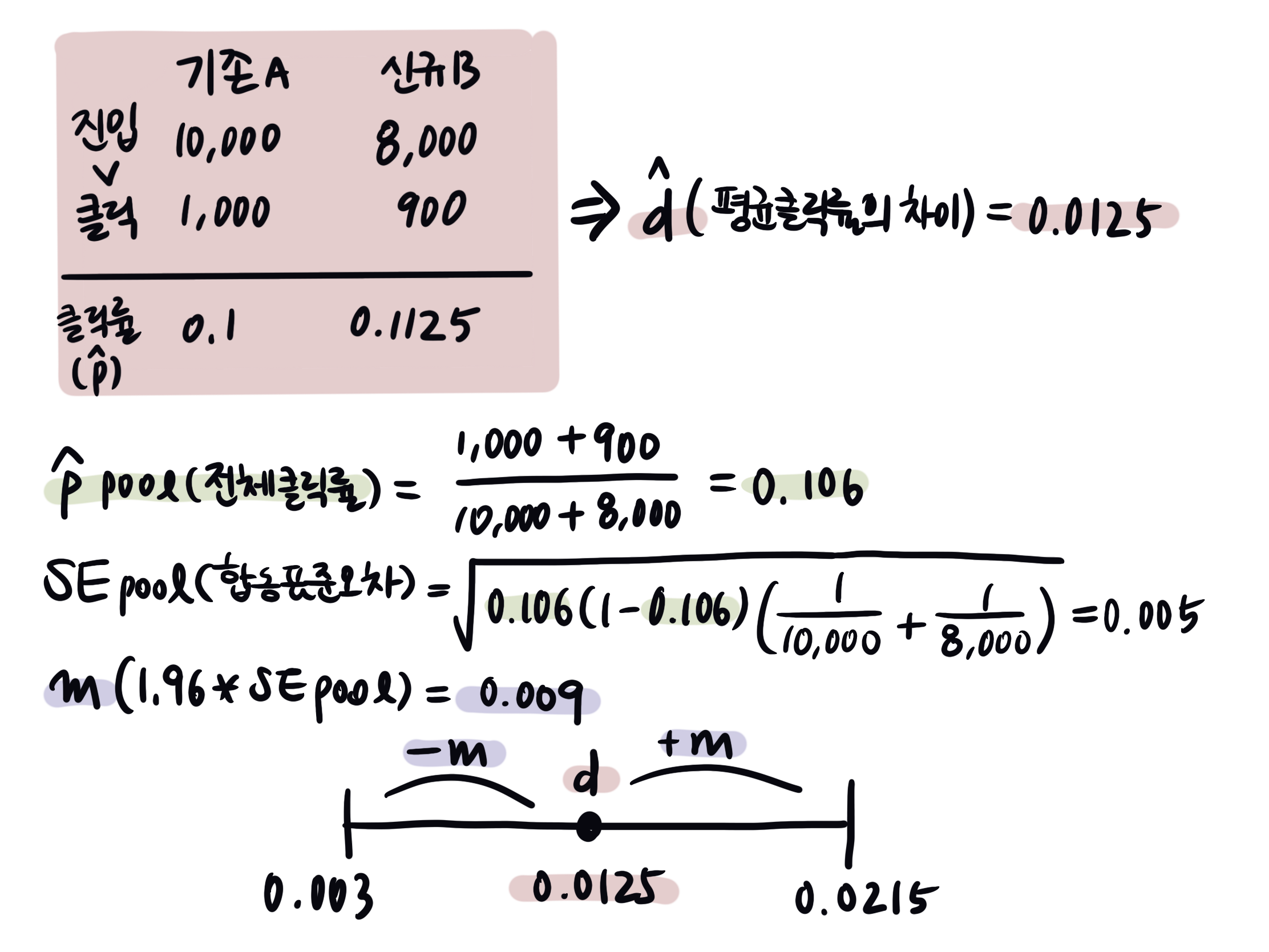 위의 그래프를 그리는 방법은 아래와 같습니다. 기본적으로 신뢰 구간 계산 방법과 동일합니다. 다만, 클릭률과 표준오차를 구할 때 A안과 B안의 합동 값으로 계산한다는 차이가 있습니다.