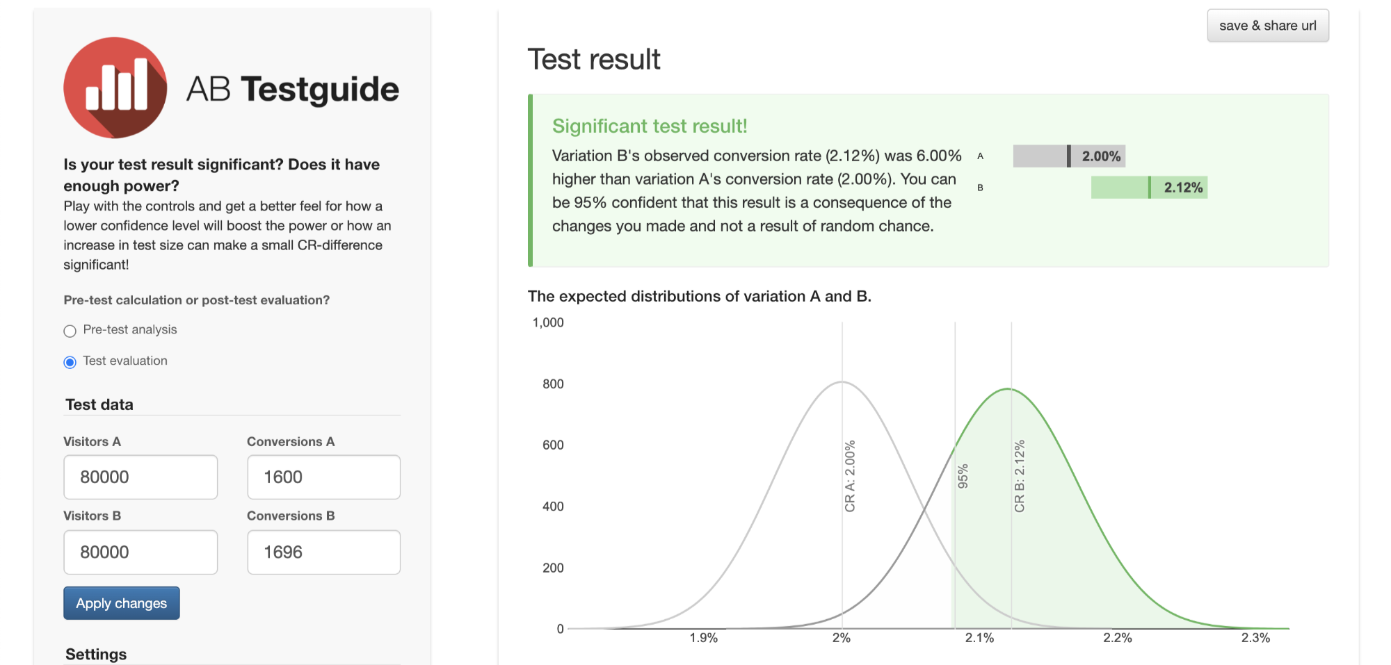 처음 A/B 테스트 결과 데이터를 받았을 때, "그래, 숫자는 나왔는데... 어떻게 분석해야 하지?"라는 고민이 생겼습니다. 찾아보니 A/B 테스트 계산기 사이트가 꽤 많더라고요. 처음 찾은 사이트는 이렇게 생겼습니다. 덕분에 A 안과 B 안의 차이가 유의미하다는 결과도 얻었고요. 다른 계산기 사이트들도 같은 결과를 내놓았습니다.