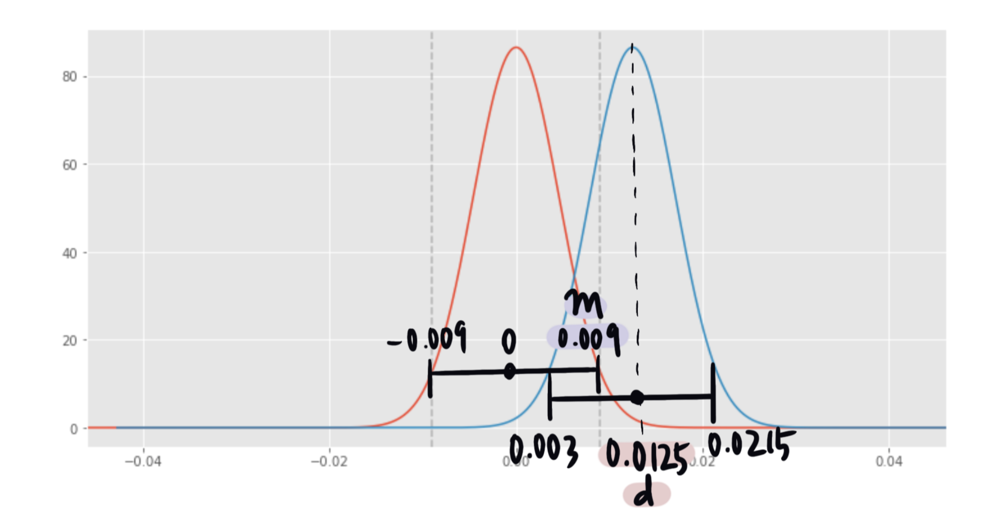 H1의 평균값(d)이 H0의 신뢰 구간 밖에 있을 때, (d<-m or d>m) H0을 기각합니다. H0이 사실이라고 했을 때 A안과 B안의 전환율 차이의 95%가 -0.009~0.009 사이에서 발견될 것입니다. H1의 평균인 0.0125는 H0의 신뢰 구간을 벗어납니다. 이 말은 H0이 사실이었을 때, 즉 두 조건 간에 차이가 없다고 했을 때, 0.0125라는 차이가 발생할 확률이 매우 낮다는 것입니다. (5% 미만) 위 그래프에서 검은색 점선이 오른쪽 회색 점선보다 우측에 위치하므로 H0을 기각하고, 통계적으로 유의하다고 결론을 내립니다.