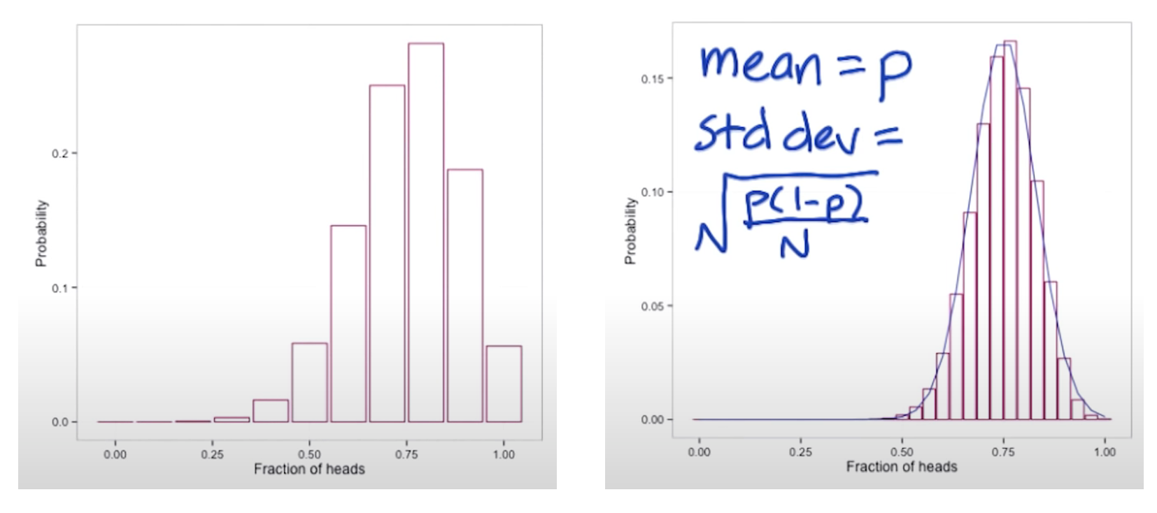 이항 분포는 N값이 높을 때 정규 분포 형태를 따릅니다. 예를 들어, 앞면이 나올 확률이 3/4인 동전이 있다고 할게요. 이 동전을 10회 던지는 시도를 여러 번 반복하고, 각 시도에 앞면이 나온 건수(비율)를 기록합니다.