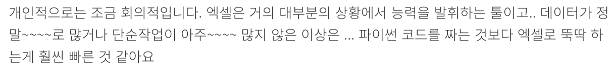 공감 가는 댓글이었습니다. 저 역시 지금 당장 쓸 수 있는 툴 중에서 엑셀을 가장 빠르게 쓸 수 있으니까요.