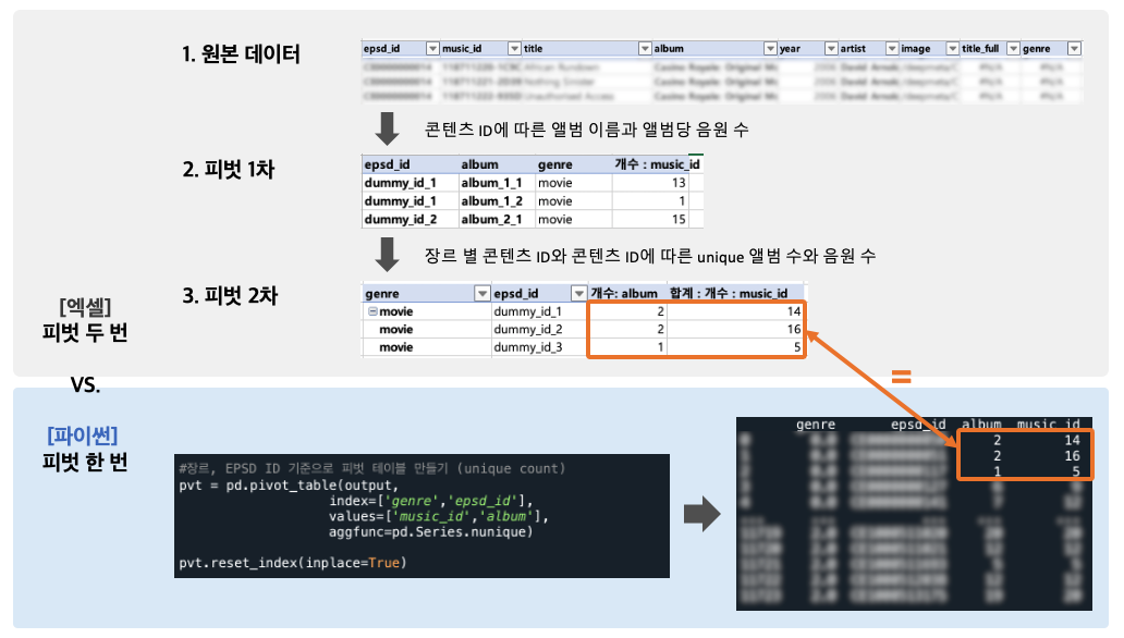 먼저, 엑셀에서는 음원 앨범과 음원 id의 unique count를 집계하기 위해 두 번의 피벗을 돌렸습니다. 같은 데이터를 추출하기 위해 파이썬으로는 pandas의 pivot_table 함수를 한 번 사용했습니다.