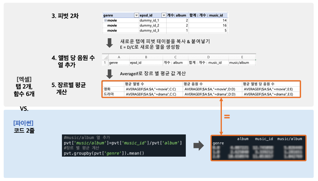 엑셀로 정리한 결과를 똑같이 만드는 파이썬 코드를 짰고, 이제 각각의 프로세스를 비교해보겠습니다.