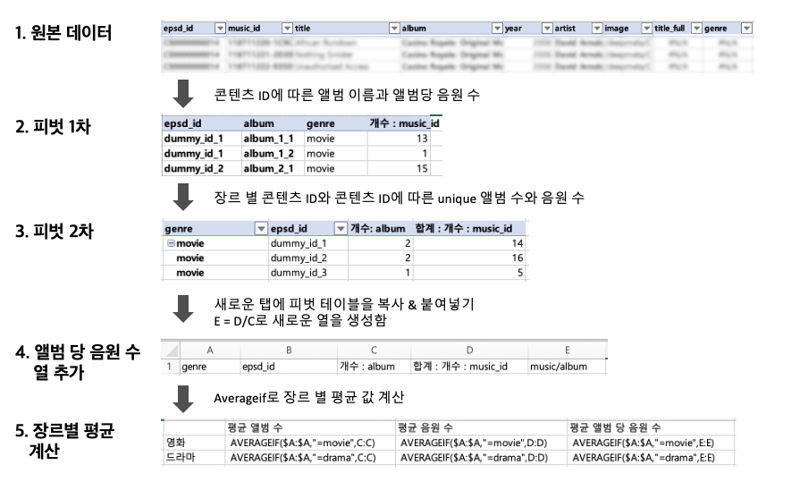 목표를 정리한 후, 데이터 추출이 필요한 테이블과 필드, 조건을 찾았습니다. 콘텐츠 DB에서 음원 정보가 한 건 이상 있는 콘텐츠와 해당 콘텐츠에 있는 모든 음원 정보를 csv 파일로 받은 후, 엑셀에서 다음과 같이 네 단계의 분석 과정을 거쳤습니다.