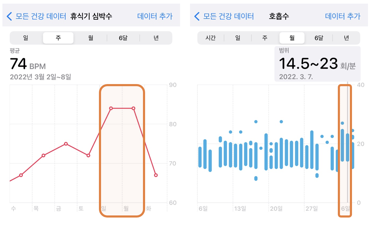 이 글을 쓴 이유이기도 하다. 나의 평소 휴식기 심박수는 평균 70 BPM이다. 술을 마셨을 때만 휴식기 심박수가 70 후반이거나 80을 넘는다. 3/5 토요일 늦은 밤부터 몸살 증상이 나타났고, 그 결과 3/6 일요일과 3/7 월요일 휴식기 심박수가 84 BPM을 기록했다. 분당 호흡수도 평소에 3회가량 많다. 화요일부터는 심박수가 정상 범주로 돌아왔다.