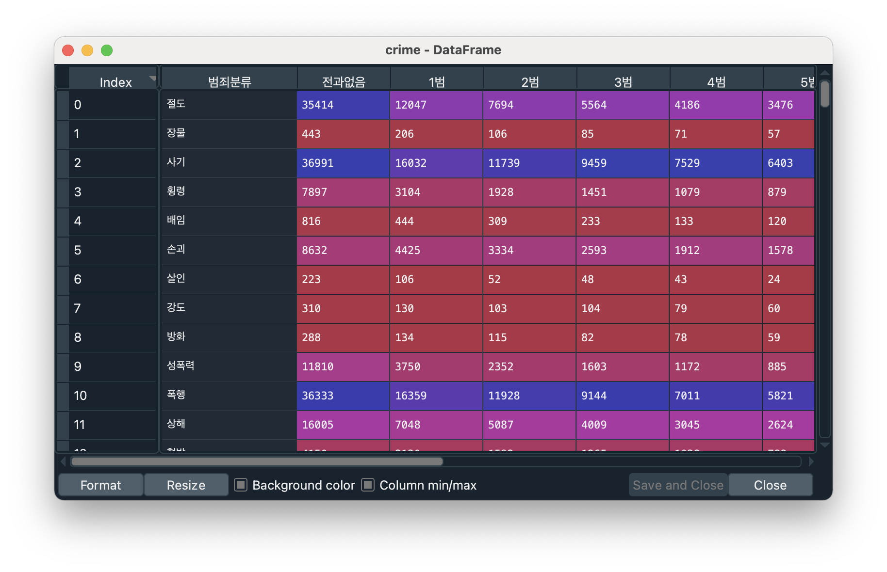 대검찰청에서 발간하는 범죄분석은 3종의 범죄통계원표를 기반으로 작성하는 자료이며 이 중 본 데이터는 범죄자의 전과유무에 따른 형법/특별법범 통계임. (단위: 명)