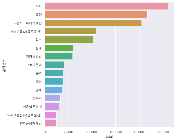 1. 각 범죄 분류 별 범죄자수 합계 (barplot)