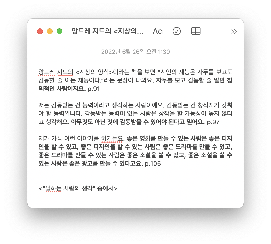 저는 감동받는 건 능력이라고 생각하는 사람이에요. 감동받는 건 창작자가 갖춰야 할 능력입니다. 감동받는 능력이 없는 사람은 창작을 할 가능성이 높지 않다고 생각해요. 아무것도 아닌 것에 감동받을 수 있어야 된다고 믿어요. p.97