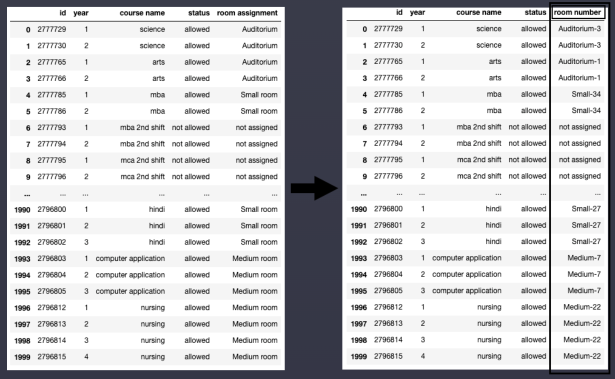 그래서 좌측의 0~2 데이터를 보면 Auditorium이 Auditorium-3, Auditorium-3, Auditorium-1이 된 것을 볼 수 있다. 나는 이 문제를 풀기 위해 다음과 같이 세 가지 스탭으로 진행했다.