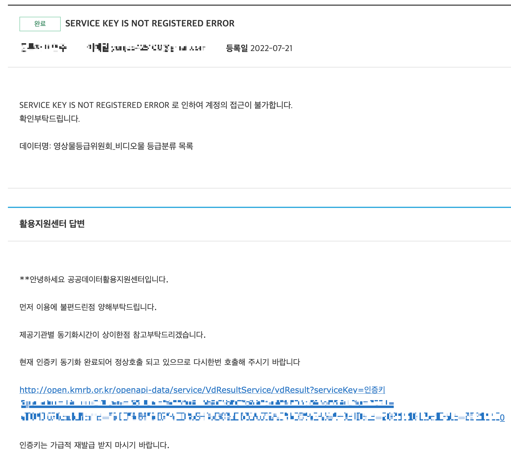 혹시 계정 동기화(?)까지 오래 걸리는 건가 해서 하루가 지난 후 시도했으나 동일한 오류 발생. 나의 문제가 아닌 것으로 판단하고 공공데이터 포털 Q&A로 직행했다.