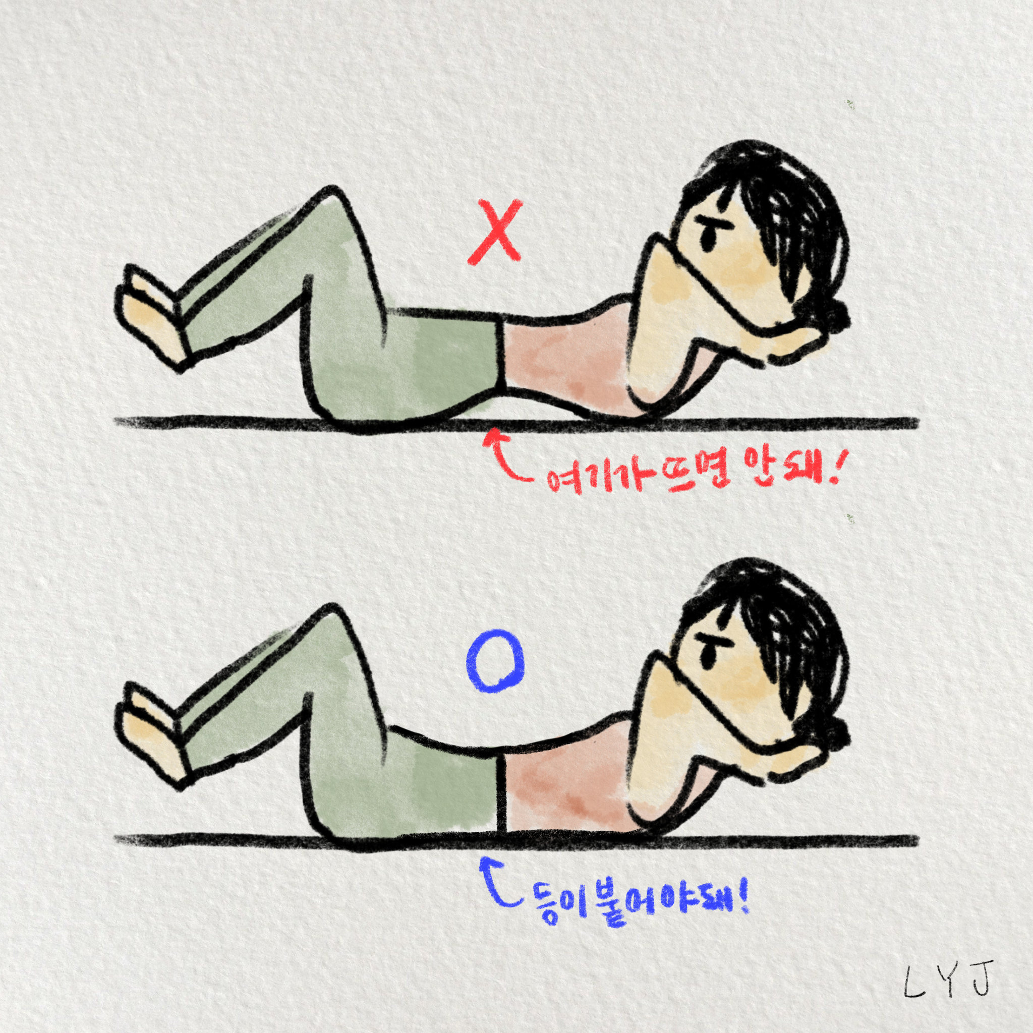 개선의 피드백 중 2, 3은 필라테스 하면서 대충 감지하고 있긴 했지만 직접 다른 선생님들께 말로 피드백을 들은 적은 없었다. 이렇게 직접적으로 피드백을 들으니까 시원하기도 하다. 선생님이 위 그림처럼 등을 바닥에 탄탄하게 붙인 상태로 복압을 유지하면서 크런치를 하루에 100번 하라고 숙제를 주셨다. 20개씩 5세트라고 하셨는데 나는 과연 100번을 할 수 있을까? 40번도 몹시 힘들던데. (ㅠㅠ) 허리가 떠서 레그 레이즈는 아직 하지 말라고 했다. 비싼 돈 내고 수업받는 거니까 열심히 복습하고 열심히 숙제도 해가야지..! 새로운 운동을 하니까 또 재미있고 의욕이 생긴다.