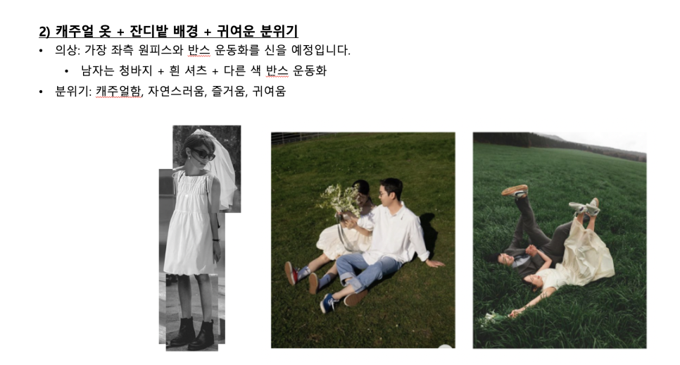 - 각 촬영지 별로 어떤 옷을 입을 것인지, 어떤 포즈로 촬영을 원하는지 레퍼런스 이미지를 넣었음